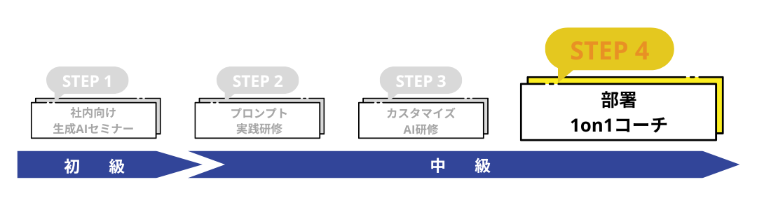 STEP4「部署1on1コーチング」は、この“ラストワンマイル”を突破するためのマンツーマンサポートです。
