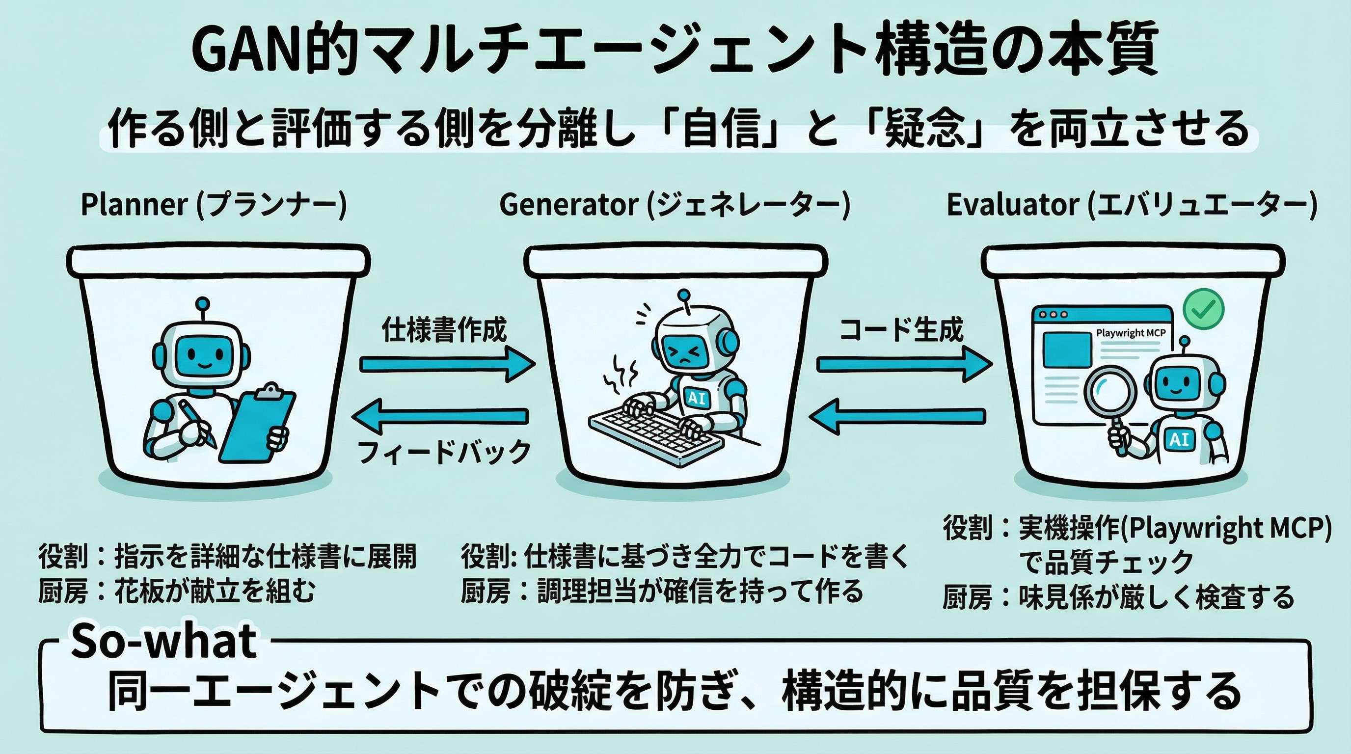 一人の人間の中で「自信」と「謙虚さ」を同時に維持し続けるのは、ものすごく難しい。でも、二人に分ければ構造的に成立する。 これがGAN的設計の本質であり、厨房で「作る人」と「味見する人」を分ける理由と、まったく同じなのです。