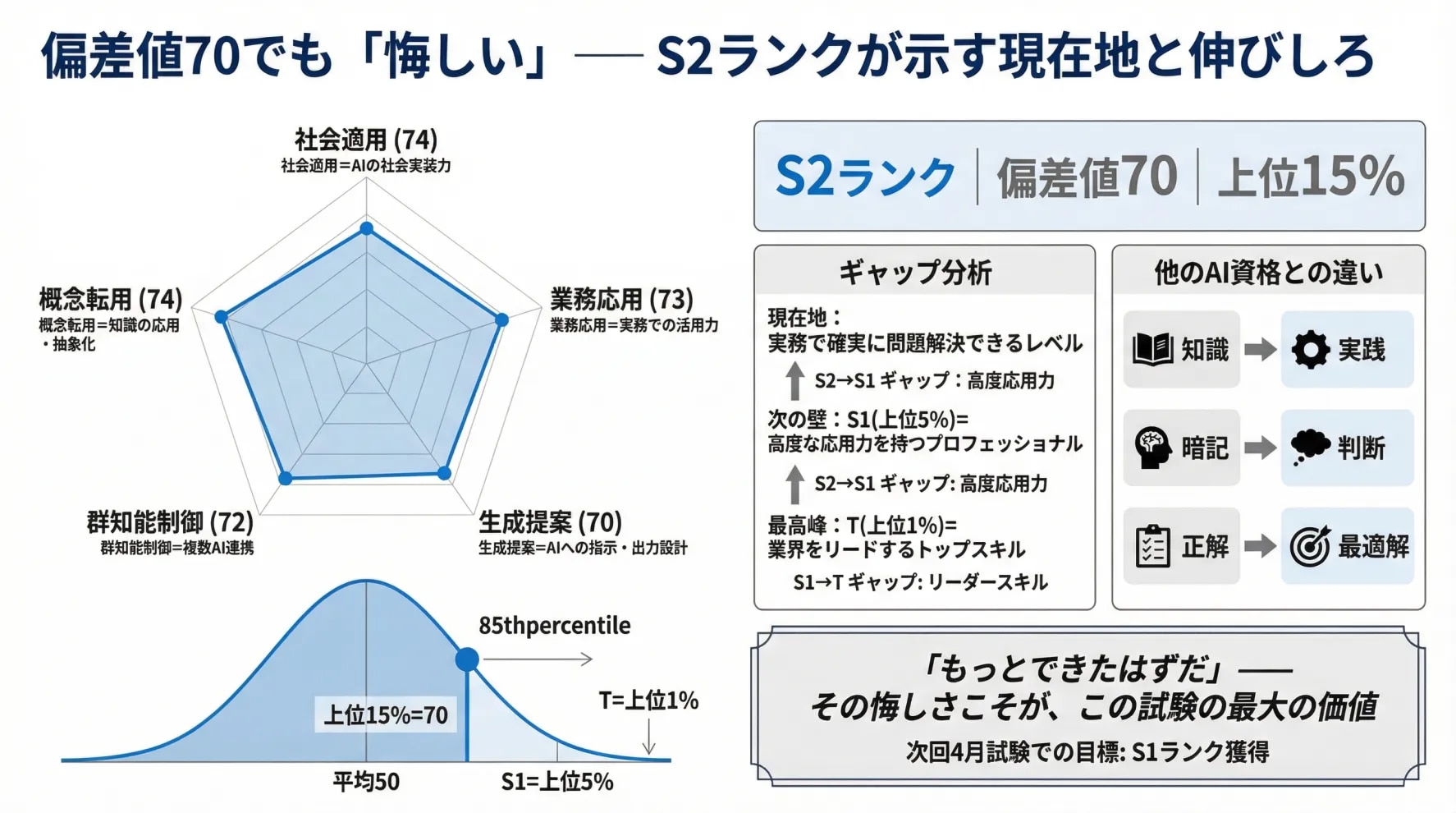 この感覚は、試験を受けた人にしかわからないものだろう。2時間の中で自分のAI活用力の「天井」が見える。まだ届かない領域が明確になる。偏差値という数字が、自分の伸びしろを冷酷なまでに示してくれる。