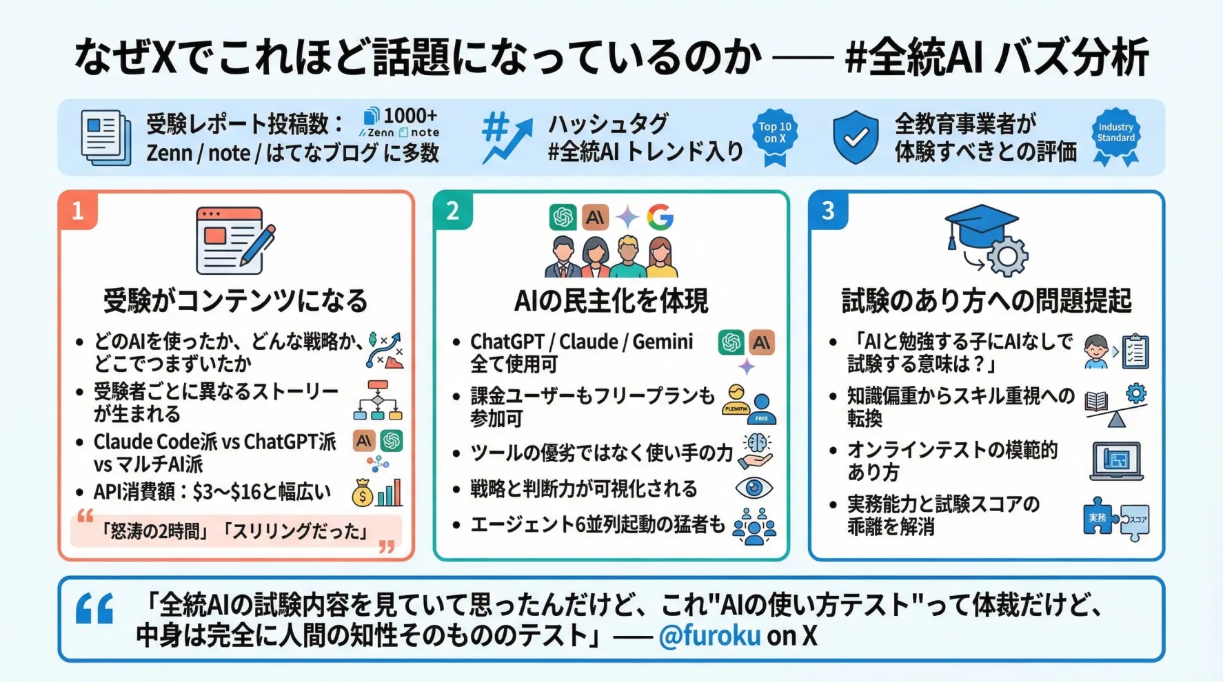 第1回試験後、X上では #全統AI のハッシュタグを中心に、異例の盛り上がりを見せた。その理由は3つある。