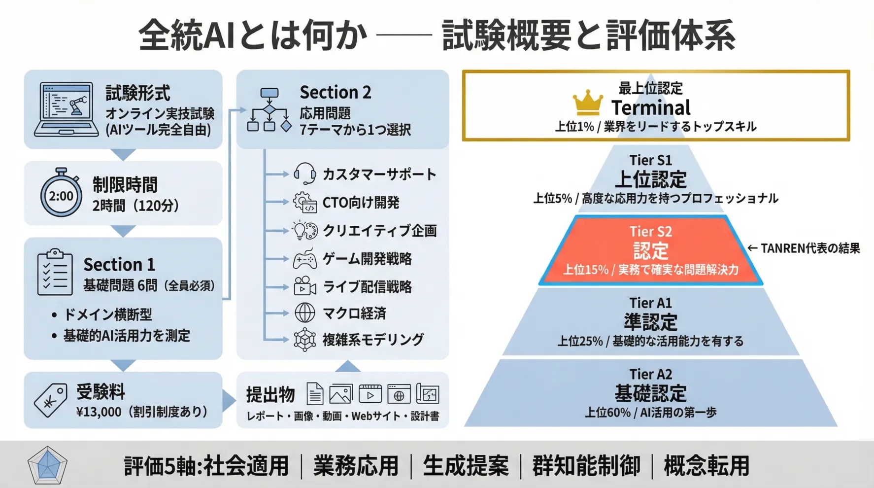 この試験は、制限時間2時間の中で、ChatGPT・Claude・Geminiなど好きなAIツールを自由に使い、実際に成果物を作って提出する完全実技型の試験だ。レポート、画像、動画、Webサイト、設計書──提出物は多岐にわたる。