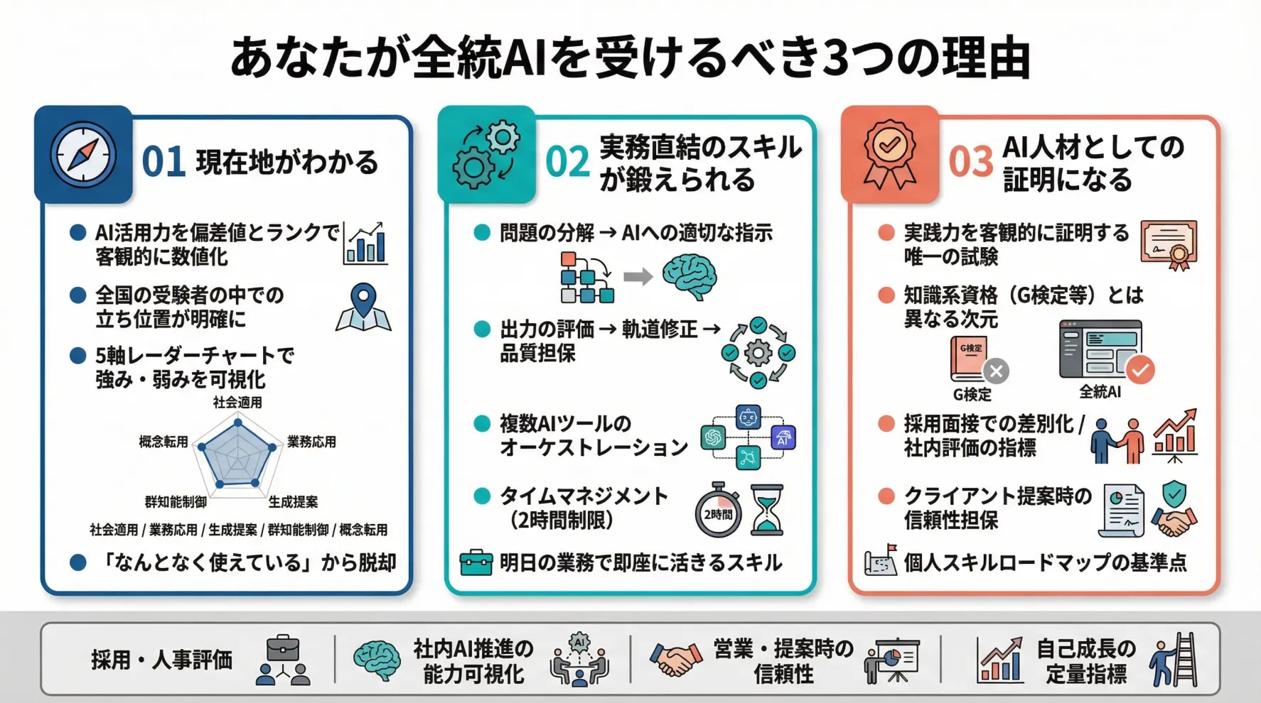 生成AI活用の実践力を客観的に証明できる試験は、現時点ではほぼない。全統AIのランク認定は、採用・評価・自己PRにおいて、他のAI資格とは異なるインパクトを持つ。