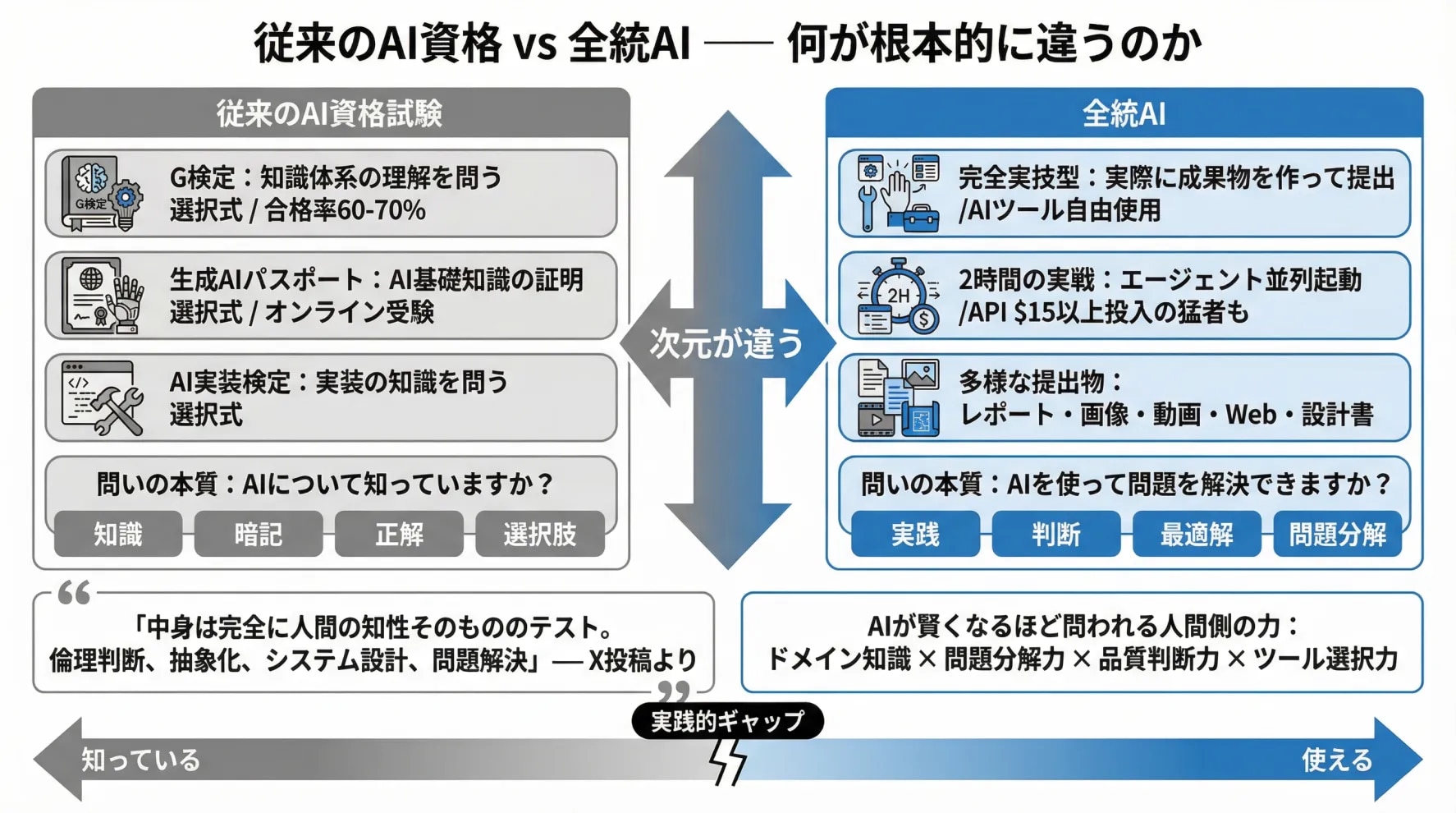 G検定や生成AIパスポートを持っていても、全統AIは別の筋肉を使う。知識ではなく、実践。暗記ではなく、判断。正解ではなく、最適解。