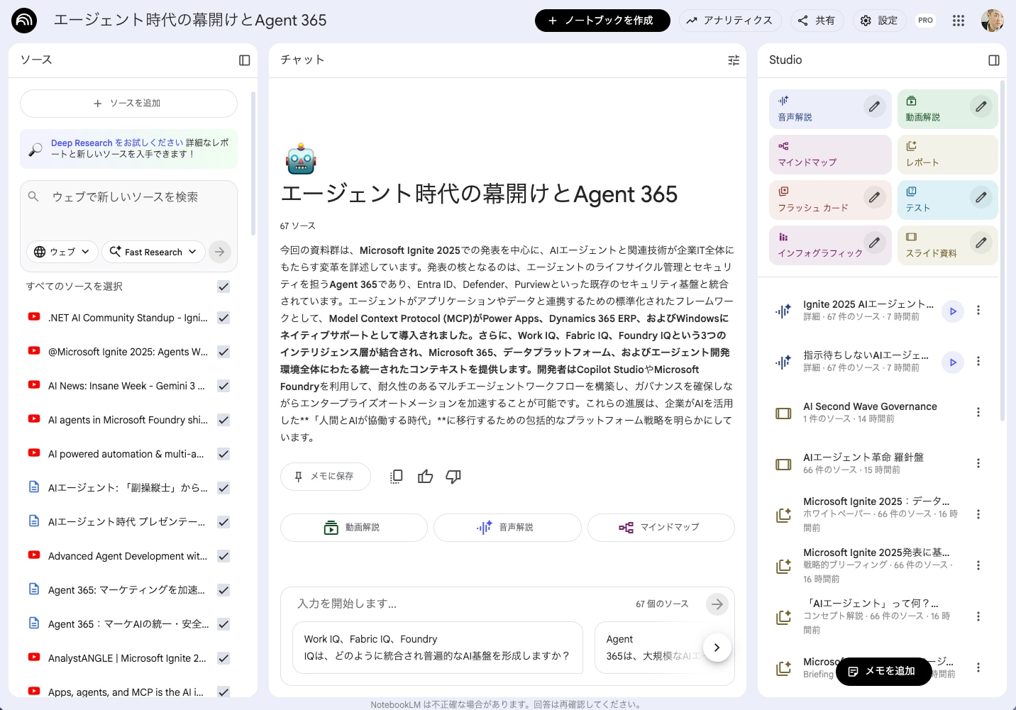 - 情報のインプット:Igniteの膨大な資料(PDFやWeb記事など数百件)をNotebookLMに放り込む。