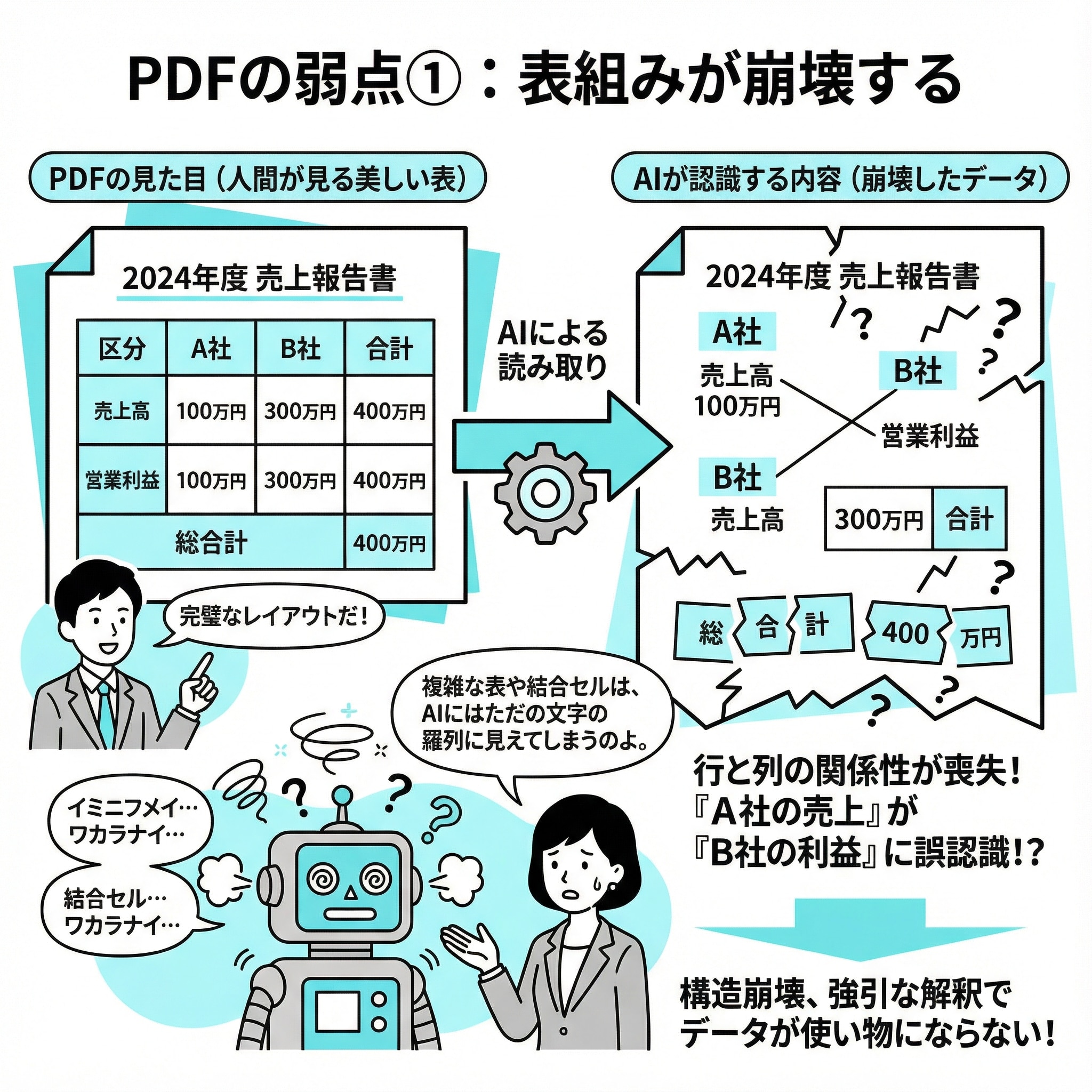 エクセルで作った美しい表も、PDFになった瞬間、AIには「意味不明な文字の羅列」に見えています。