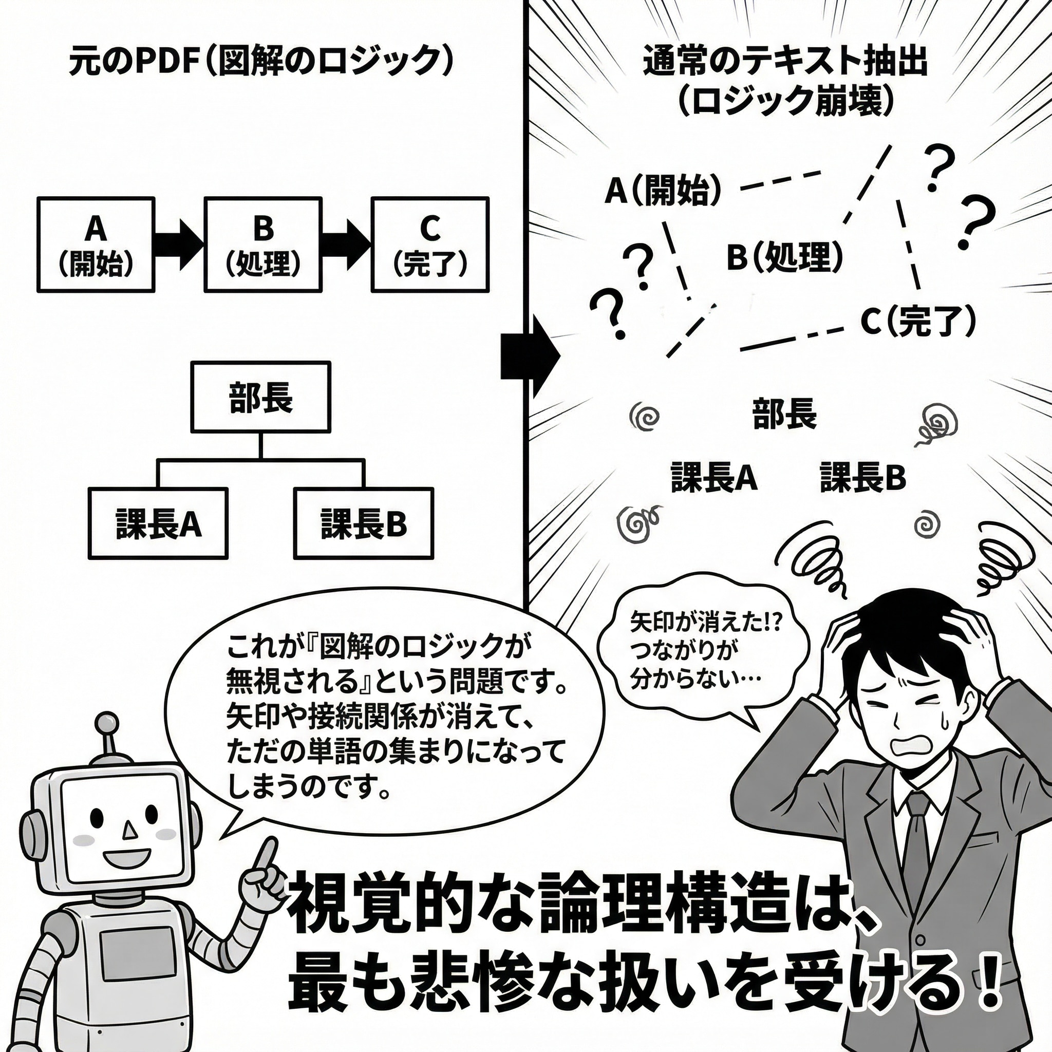 フローチャート、組織図、プロセス図、相関図――これらの「視覚的な論理構造」は、PDFのテキスト抽出において最も悲惨な扱いを受けます。