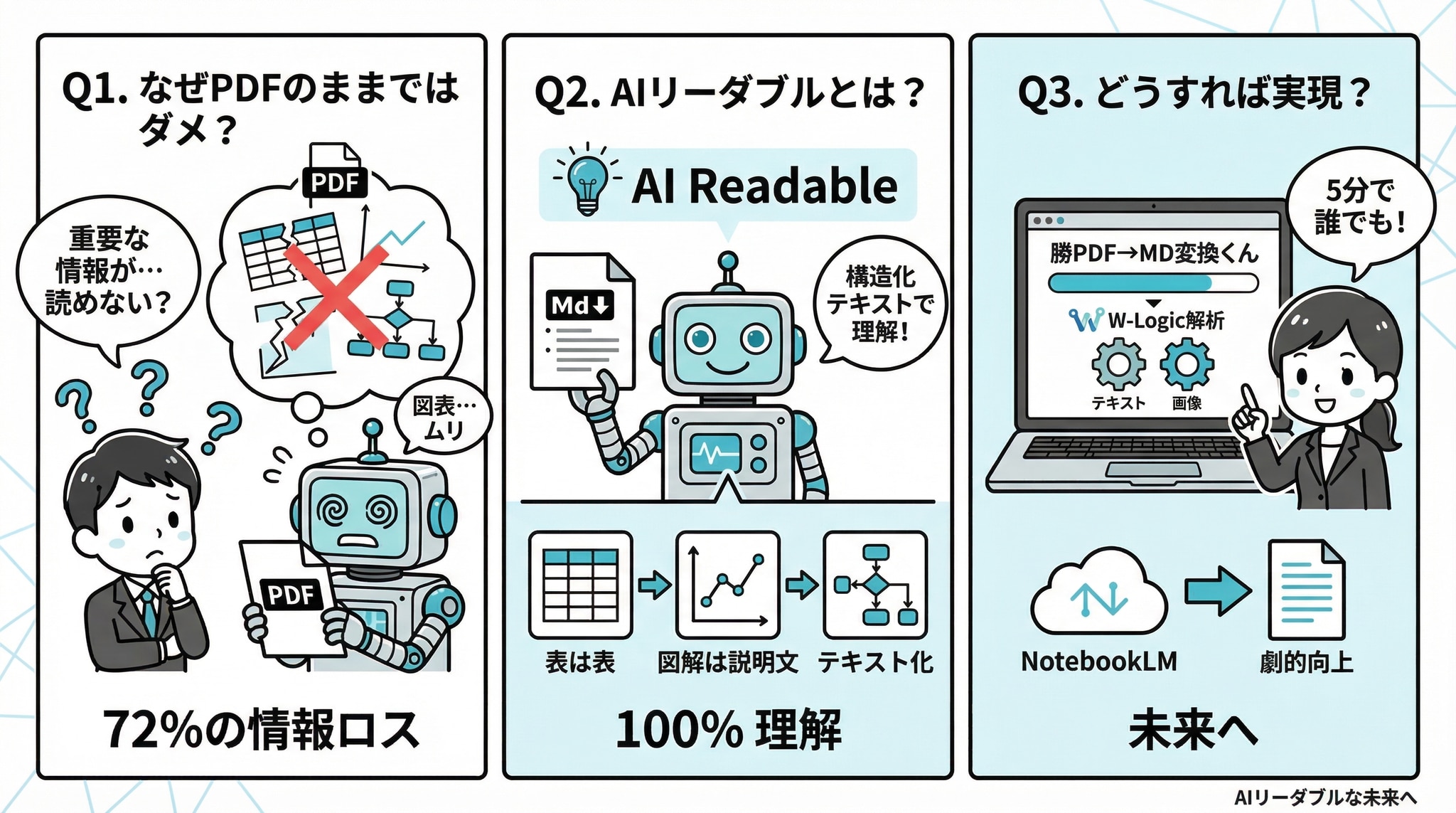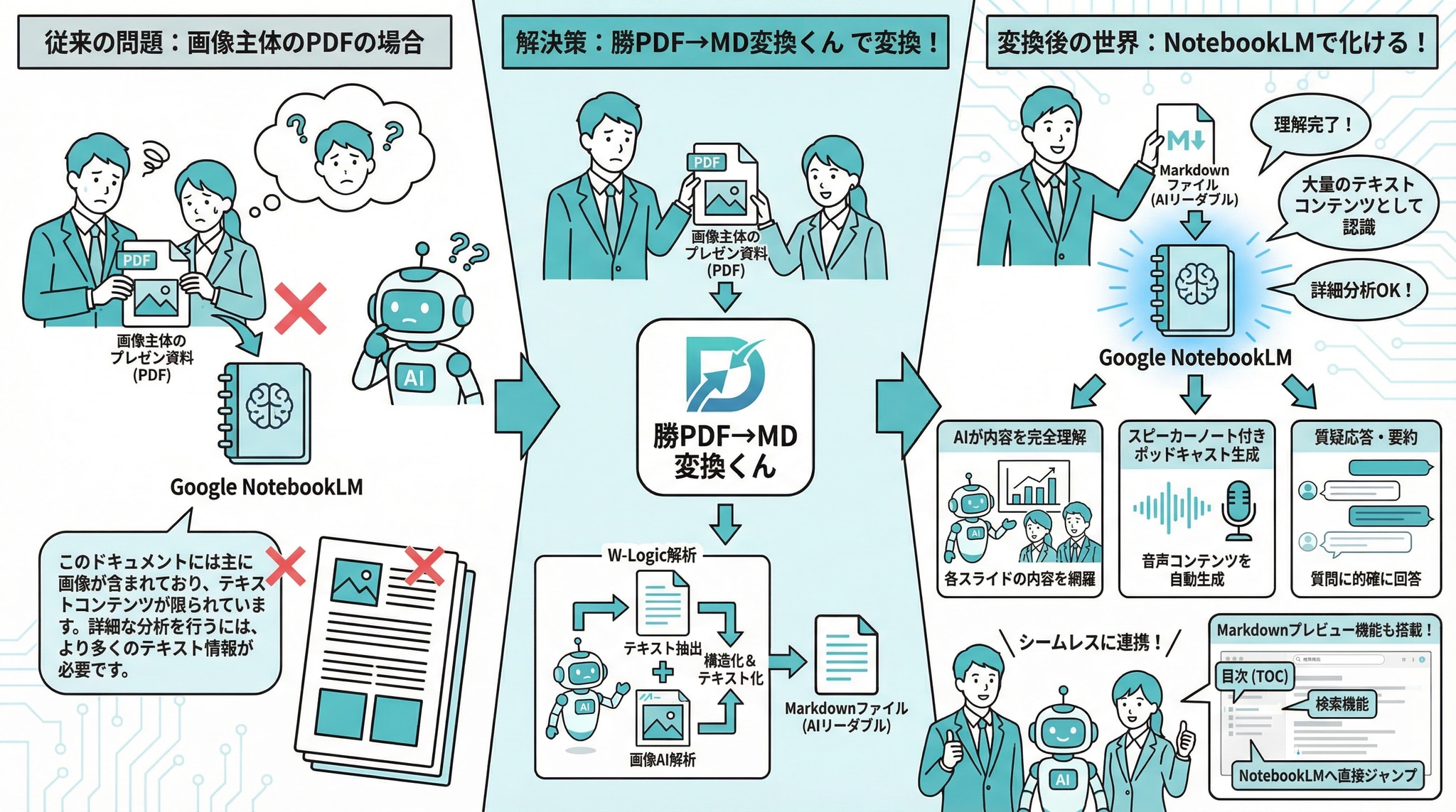 W-Logic解析により、テキスト+画像の二重構造でPDFの全情報をキャプチャ。NotebookLMをはじめとする後続AI処理の精度が劇的に向上します。