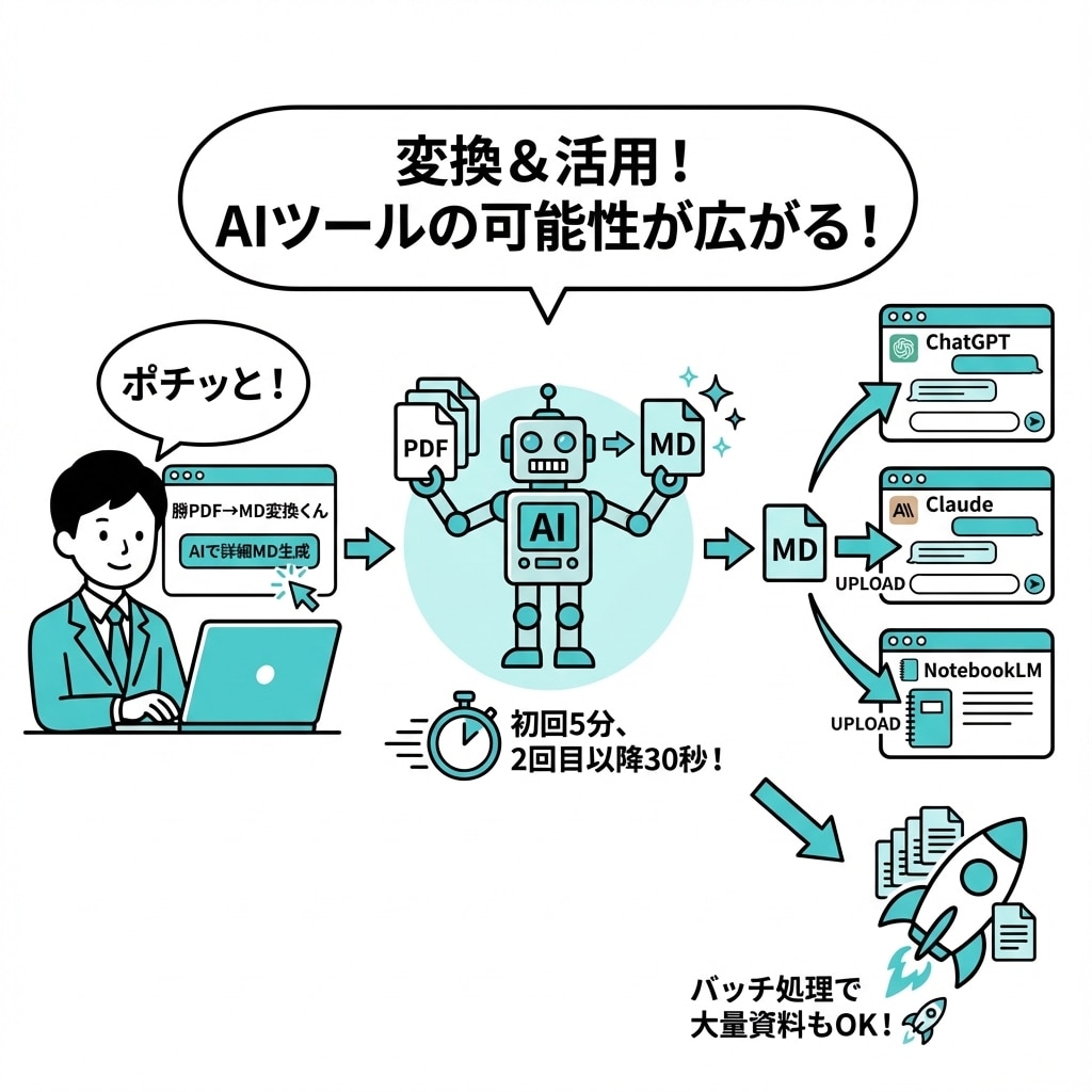 A. 「勝PDF→MD変換くん」を使えば、5分で誰でも実現できます。