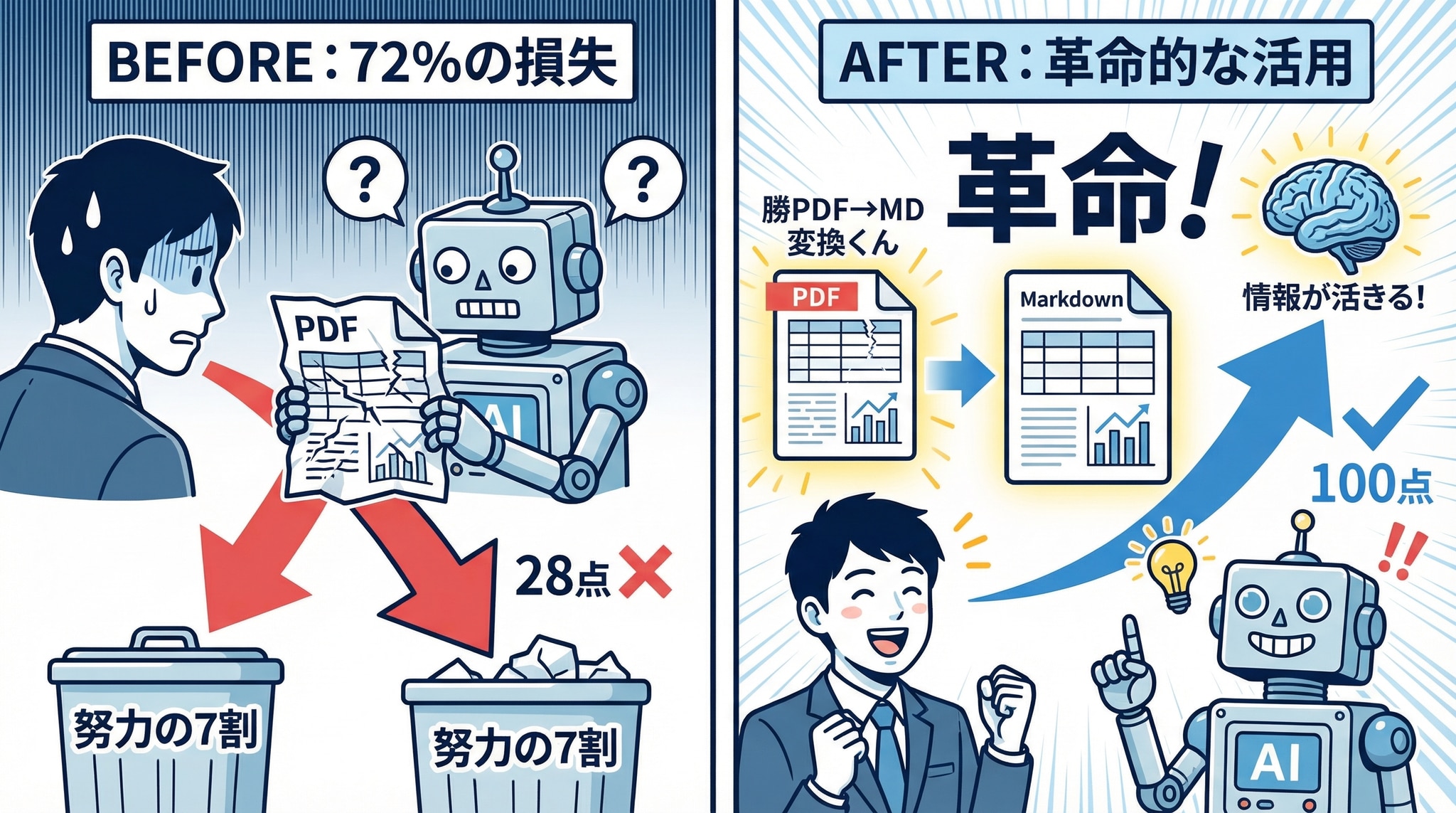 という実証結果に基づいています。詳細は後述しますが、同じ内容のPDFとMarkdownをAIに読ませて評価したところ、100点 vs 28点という衝撃の差が出たのです。