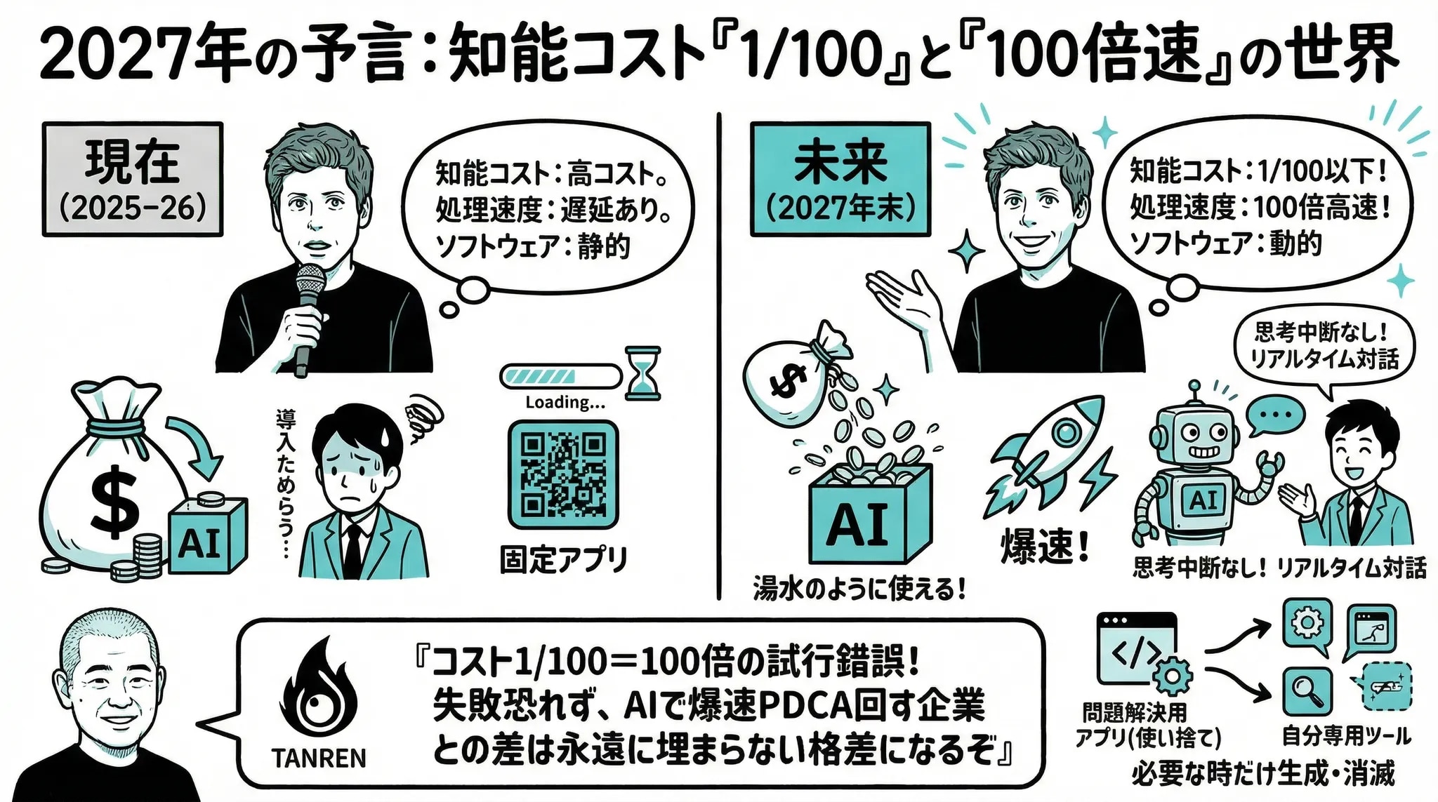 知能コスト | 高コスト | 現在の1/100以下 | 躊躇なくAIを使える。全社員にAI秘書が付く。 |
