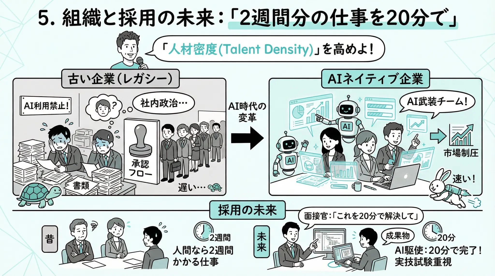 - 5.組織と採用の未来:「2週間分の仕事を20分で」