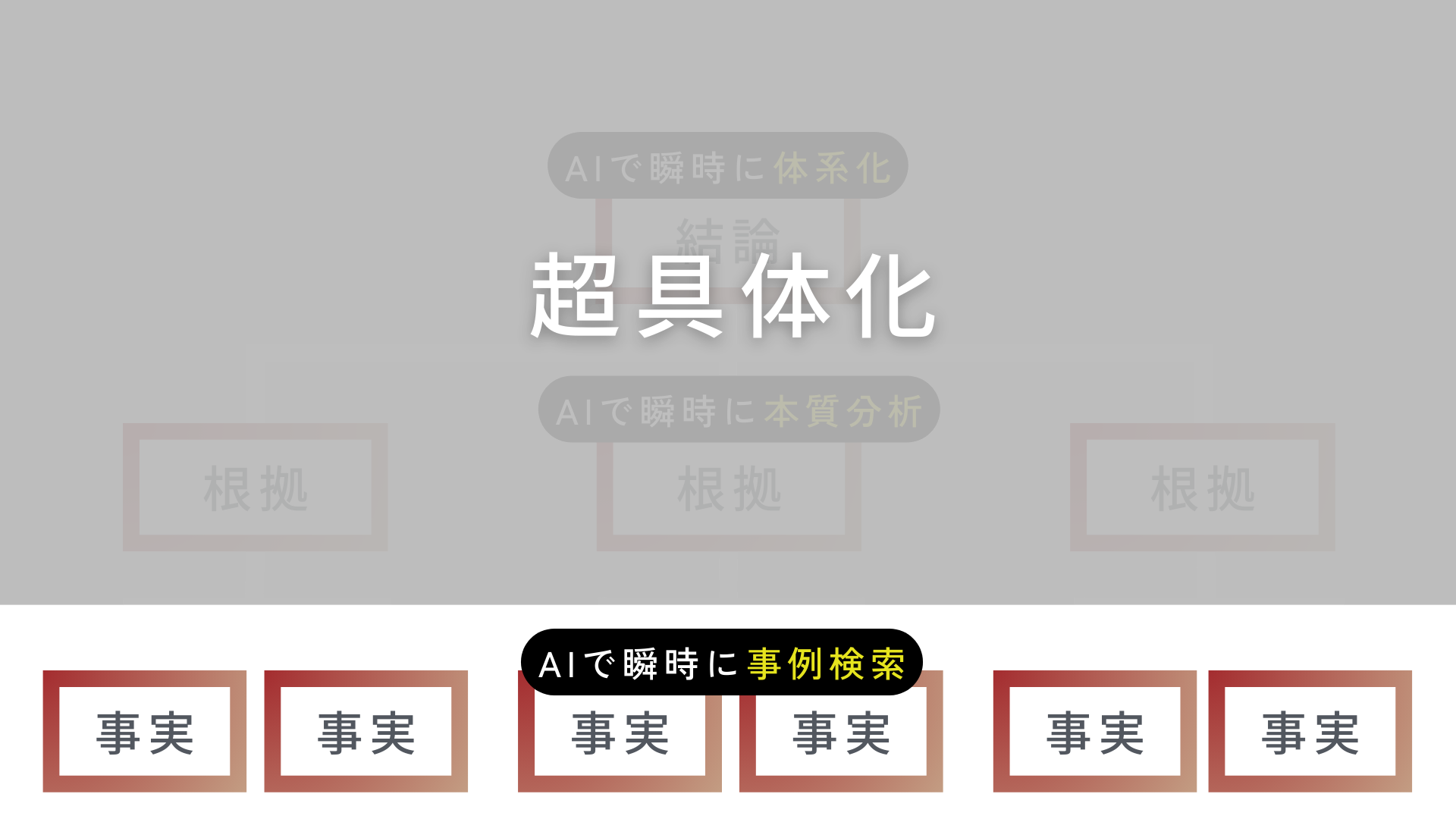 集めた事例をAIが瞬時に分析し、超具体化した事例を束ねて、AIが本質的なパターンと法則を抽出。「覚える」学習から「理解する」学習へ。記憶に頼らない真の理解を実現します。