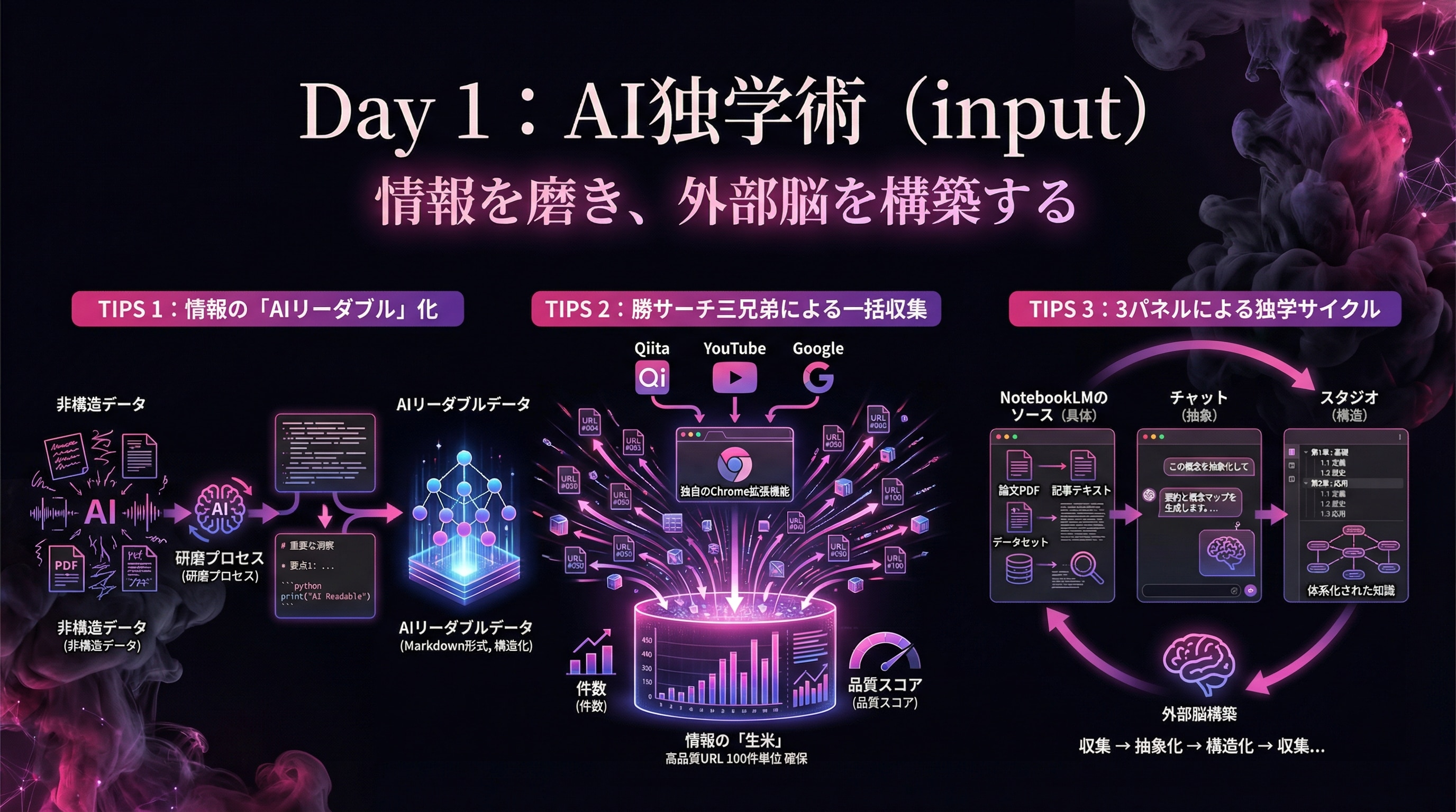 ・NotebookLMの実務適用: 書籍1冊相当の情報を処理し、約5分の要約動画を生成。所要5〜15分で完了