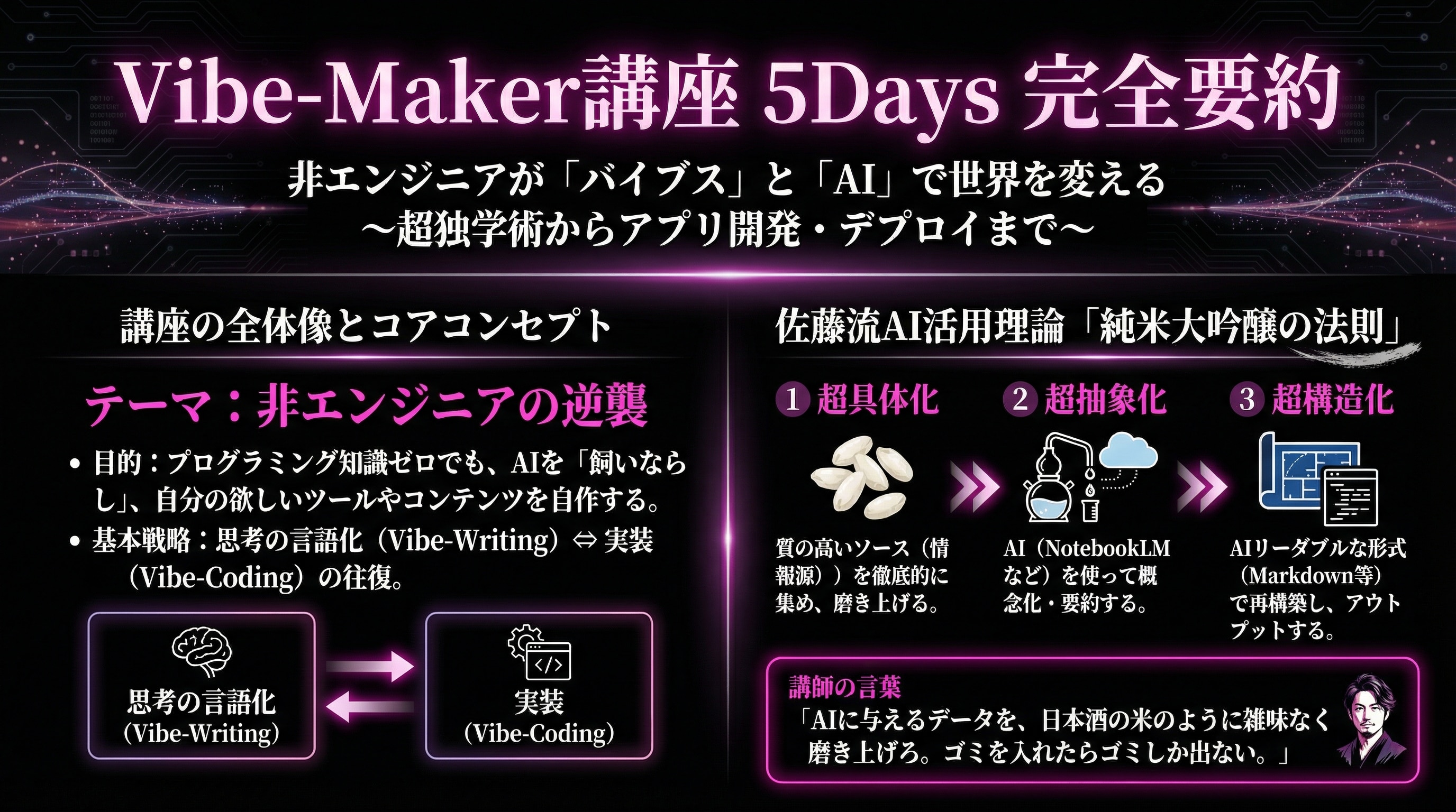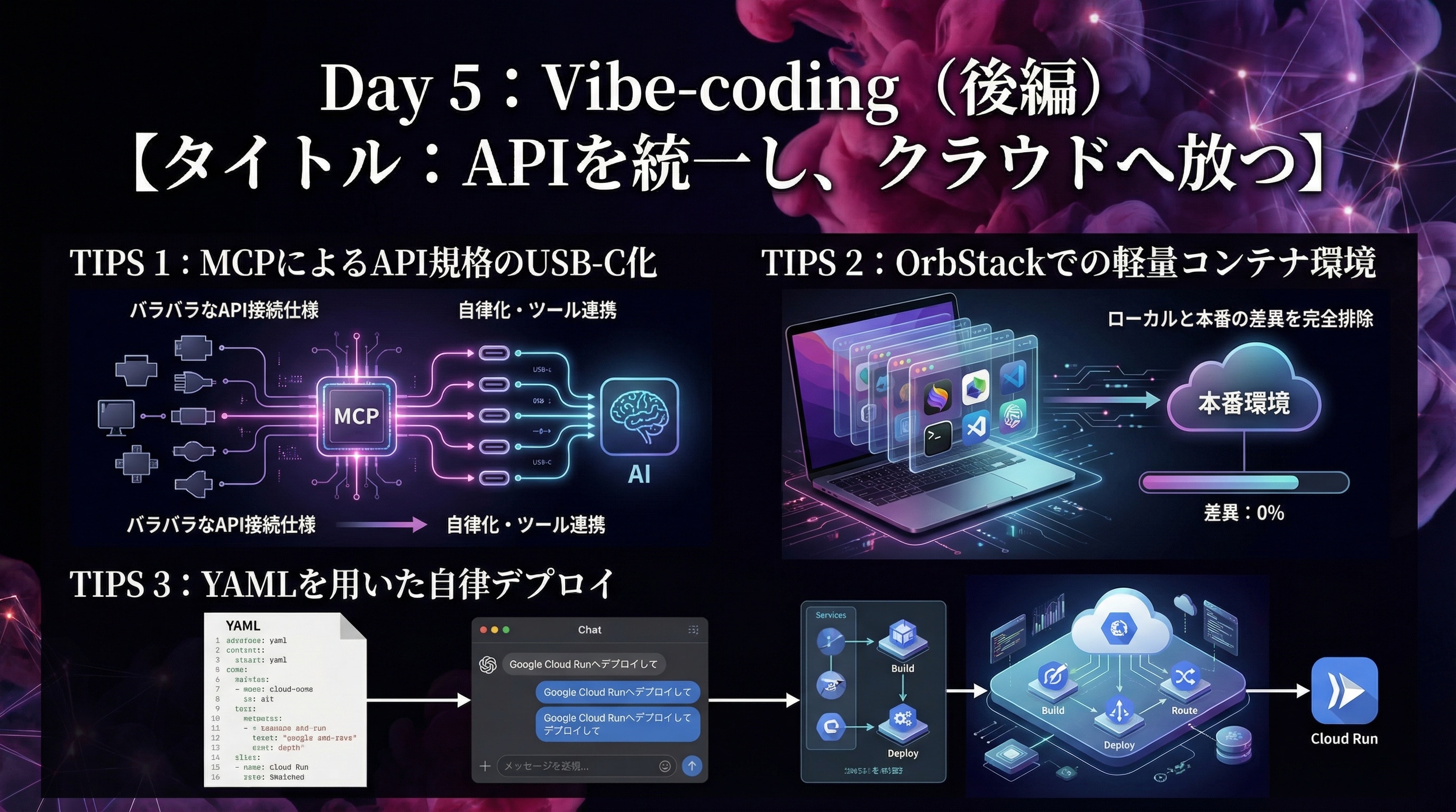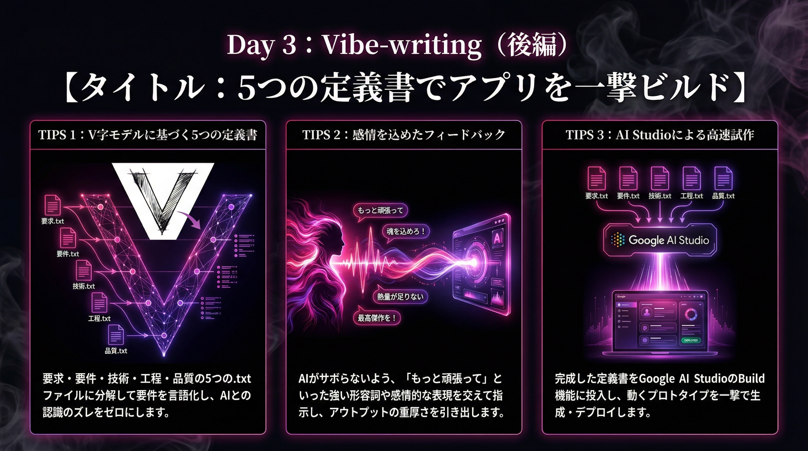 ◎ 5日連続・各日120分。Vibe定義からプロトタイプ設計までを一気通貫で習得